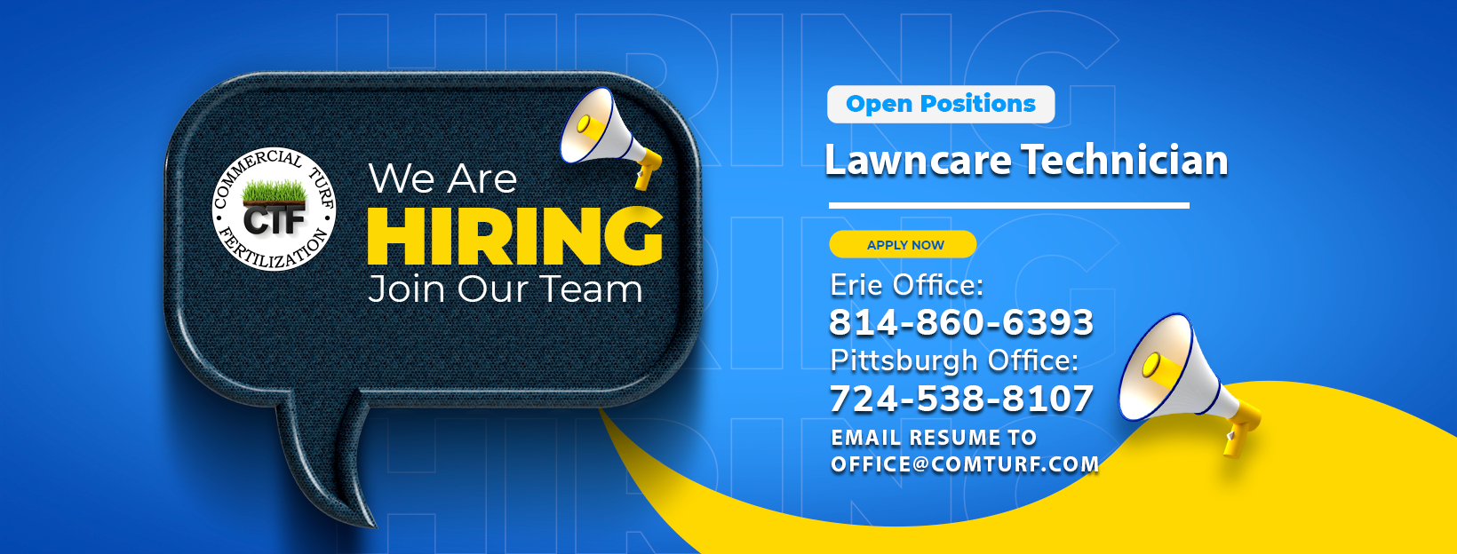 Please submit your resume and a brief note about why you’re interested to office@comturf.com or call us at 814-860-6393 (Erie Office) or 724-538-8107 (Mars Office). Include “Lawn Care Technician” in the subject line.